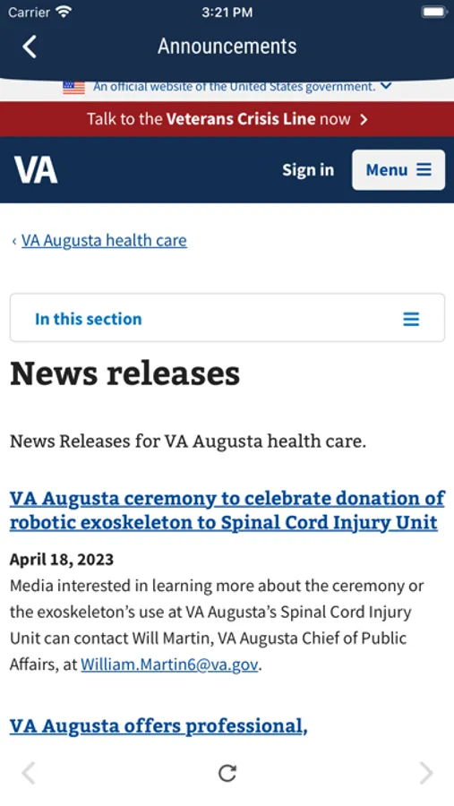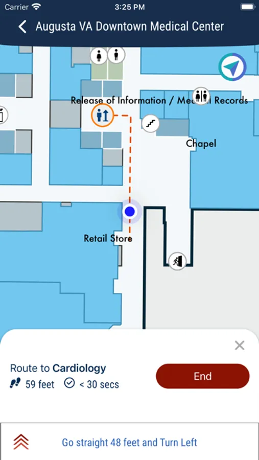 The Veterans Affairs Wayfinding App is a FREE app that helps Veterans quickly locate clinics and amenities in the VA hospital and provides real-time, turn-by-turn directions. It is simple to download and use. Once downloaded, select the default VA hospital, look up a destination and the app will display the map with directions and navigate to the destination.