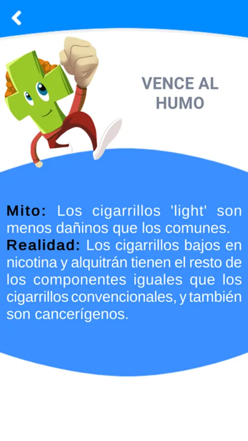 Adicionalmente en la aplicación se despliegan datos de interés,mitos o verdad relacionados con la temática principal.