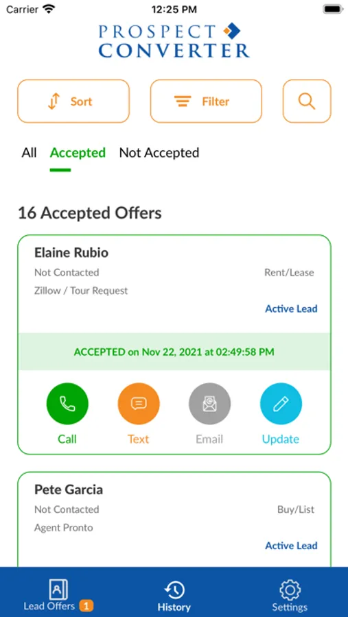 Receive lead offers from your broker quicker and manage them more efficiently with ProspectConverter's Lead App. Accept lead offers, quickly make contact, document your conversation and set a reminder for the next follow up task. Data is instantly synced to your PC/CRM application.