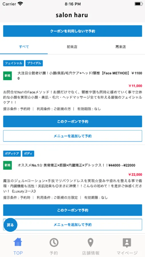 お得なクーポンが配信されます。ネット予約時にクーポン利用での予約も可能なので来店時もスムーズに施術頂けます。