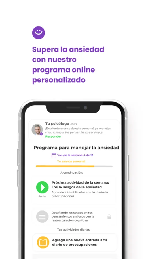 Descarga esta app y comienza un proceso terapéutico basado en terapia cognitivo-conductual de manera gratuita para superar tu ansiedad. Recibe acompañamiento de psicólogos profesionales. Accede a herramientas basadas en ciencia para mejorar tu salud mental. Haz seguimiento de tu mejora, practica mindfulness, aprende a manejar tus pensamientos y emociones y mucho más.