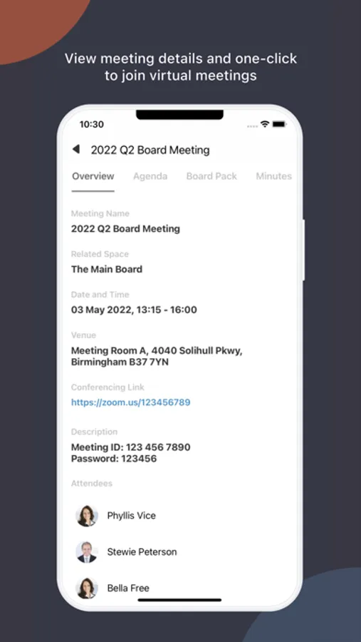 See all your upcoming board and committee meetings with details such as date/time, location, attendees and shortcuts to all related materials conveniently in one place.