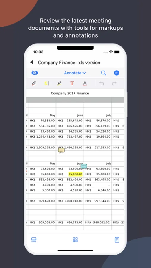 Built-in annotation tools let you make private markups (with Apple Pencil support), notes and share comments with others directly on the document pages. Annotations are easily searchable and remain with you anytime you open the board pack.