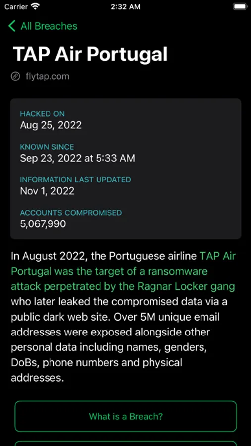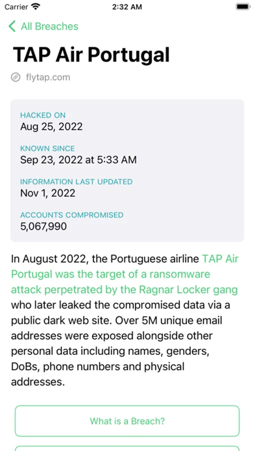"Was I Hacked?" is a free resource for anyone to quickly assess if their data or an online account has been compromised in a data breach. This app is built on top of the "Have I Been Pwned" API. HIBP tracks when a website gets hacked so that those affected can be informed and can take action promptly.