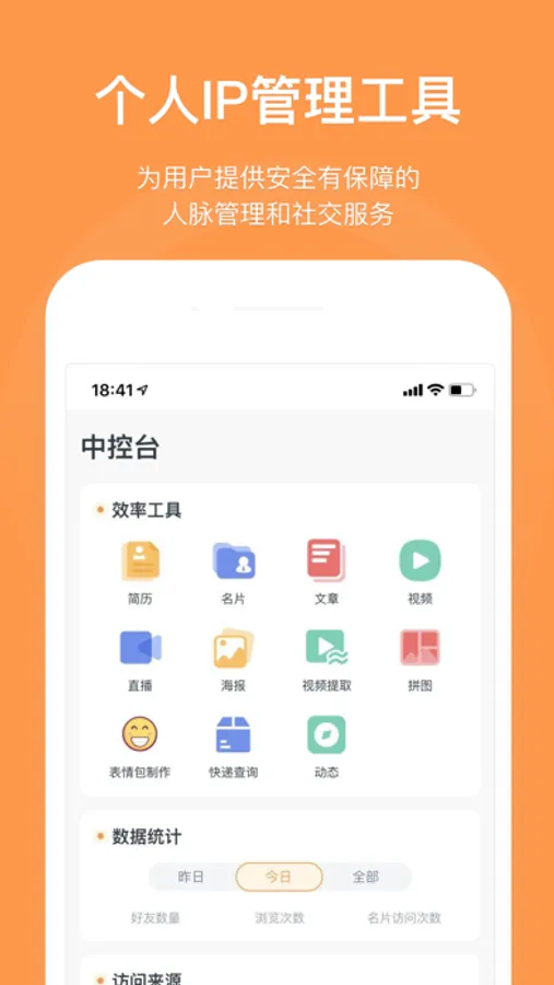 可一键存储到手机通讯录,也可通过社交软件快速“发”出去,实现个人品牌快速传播。并且在不加微信好友,不暴露私密数据的前提下,所有访客都可以查看、评论和转发个人动态,实现私密级社交传播。
