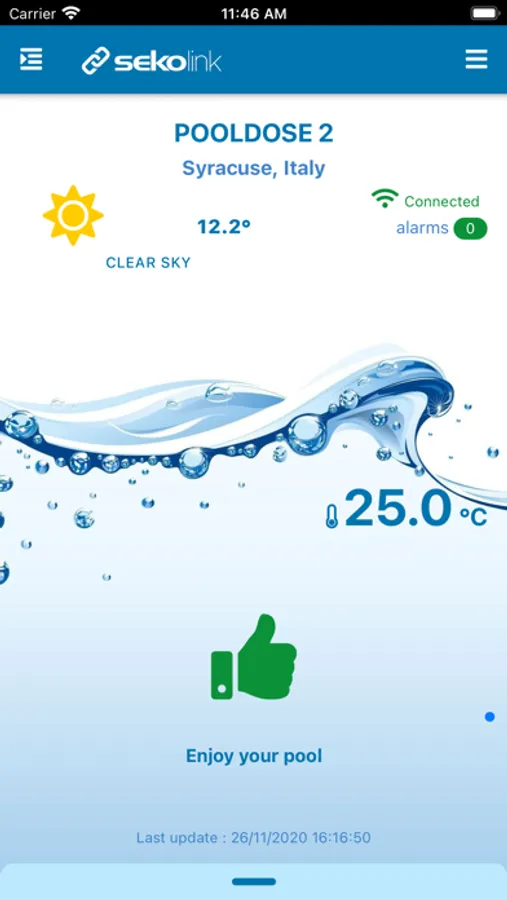 Expressly designed for the final users, SekoLink is an intuitive APP that grants users quick and easy access to their own SEKO devices installed in the field, to visualize at a glance the health condition of their installation and to have access to relevant parameters at a swipe, also giving some limited control functions. Intuitive icons show immediately the current situation of the plant, with an upward thumb if everything is going well, a downward thumbs if some parameter is out of the admitted range and a wrench if it’s the case to call technical service. Depending on the applications, different parameters are used to evaluate the health status of the installation and to give the right advices to the users. The APP also offer some limited control actions, such as starting or pausing the dosing system or, in some case, switching to a different dosing program, but is thought to let the final user to operate in total safety, without giving him the possibility to change, by mistake, critical parameters of the devices, whose management is left to technicians.