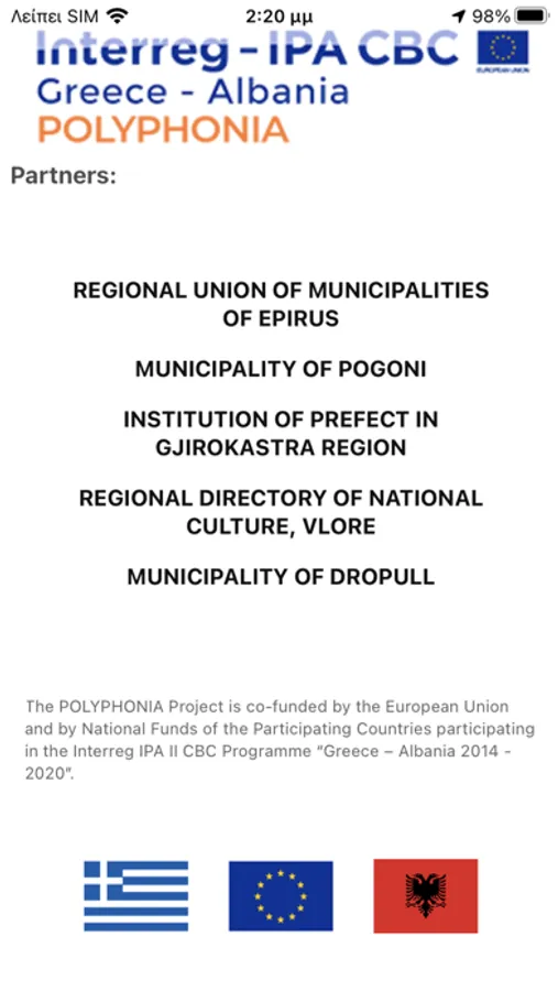 The regions of Epirus, Gjirokaster & Vlore are rich in cultural heritage of polyphonic music. The geographic isolation has contributed greatly to the fact that this particular genre is so distinctly different from the rest of the Balkans and surrounding European countries. Indeed, the similarities between the Epirotic and South Albanian polyphonic songs, are overwhelmingly greater than their differences, while the main distinction between them is merely linguistic. Similar melodious expressions, unfolding & flourishing through the ages, exceeding the borders of history to meet the structures of myth, form a collective, homogenous and interdependent feature of the cross-border area, the polyphonic music. Both in Epirus & S. Albania there is an urgent need to study, collate and preserve this rich and authentic musical heritage, from which valuable information can be derived in a series of disciplines such as ethnomusicology, aesthetics, anthropology & history. This very cultural asset, the Project POLYPHONIA seeks to preserve, as an integral element of the intervention area and also valorize, through the instrument of thematic tourism, tapping significant inland undeveloped potential (traditional villages etc.) and improving the region’s attractiveness, to bring about prosperity and economic growth, while building bridges between the people and the Nations.The main outputs of the Project will be the development of the POLYPHONIA Cultural Brand and Thematic Route that will be utilized to efficiently and productively exploit polyphonic music in terms of cultural and thematic tourism, through the establishment of a Cross-border Virtual Reality Museum & Exhibition & an Augmented Reality Tourist Application for tablets/smartphones. POLYPHONIA also entails actions of enhancing the awareness of cross-border cultural heritage, such as the establishment of two CB Centers for the provision of tourist information, musical knowledge & the conduction of workshops.Moreover, the Project’s Network will represent a common field of actions of cooperating organizations, in the fields of cultural values & tourism development. In this context a Polyphonic Caravan will be created, touring both sides of the borders, giving life to small villages of the countryside. Finally, to capture and broadly celebrate the essence of polyphonic music heritage, a two Day Festival & Conference will be held jointly in Gjirokaster & Pogoni. POLYPHONIA will build on the “virginity” and beauty of the N. Epirus and S. Albania polyphonic music, as a rare and valuable asset of the area and utterly preserve and cherish it to create an integrated cultural tourist product of cross-border importance.The Project addresses several dimensions of EU policies, such as culture and sustainable tourism. Compatible with iOS 15.