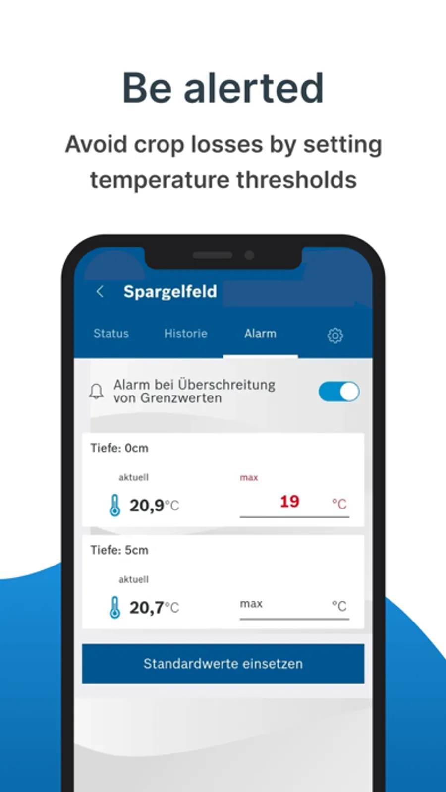 Deepfield Connect - Asparagus Monitoring überwacht die Temperaturen im Spargeldamm für Sie in allen Ihren Feldern. Temperaturfühler in vier unterschiedlichen Tiefen ermöglichen eine exakte Temperaturmessung durch die gesamte Saison. Sichere Datenübertragung auf Ihr Smartphone erlaubt Ihnen den Einblick in die Daten überall und jederzeit. So haben Sie die perfekte Entscheidungsgrundlage für die Foliensteuerung.