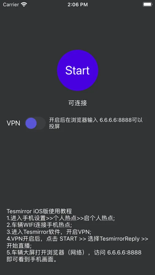 3. Open the browser on the big screen of the Tesla and visit ***6.6.6.6:8888*** to see your iPhone screen.