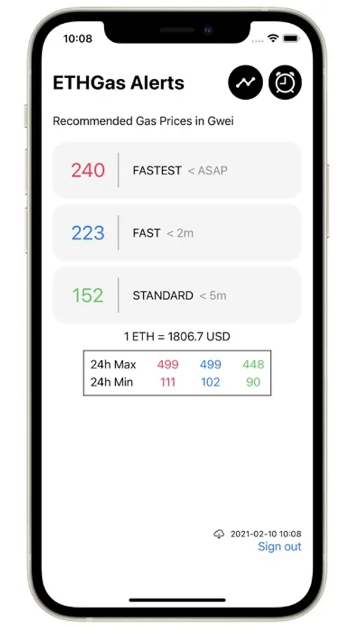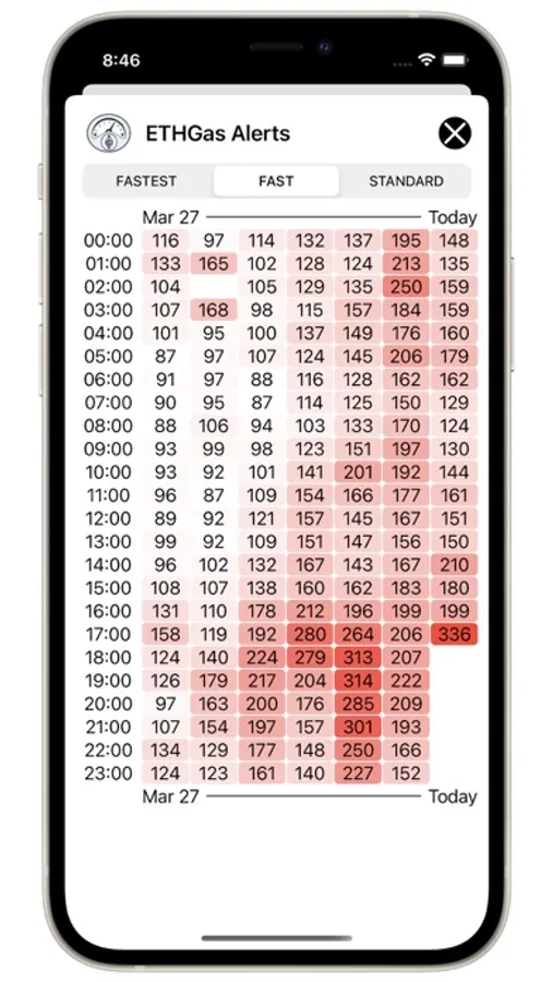 The application allows multiple alerts to be set, and when the Gas fee exceeds a given value, the user will receive a Push notification on all their devices registered with the same account.