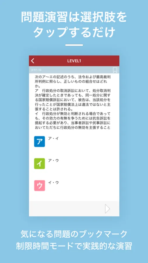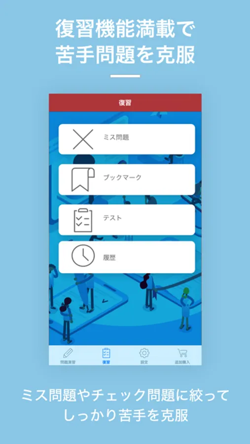 テスト機能、ミス問題だけを復習、苦手な問題をチェックしてチェック問題のみ復習で着実にレベルアップ。