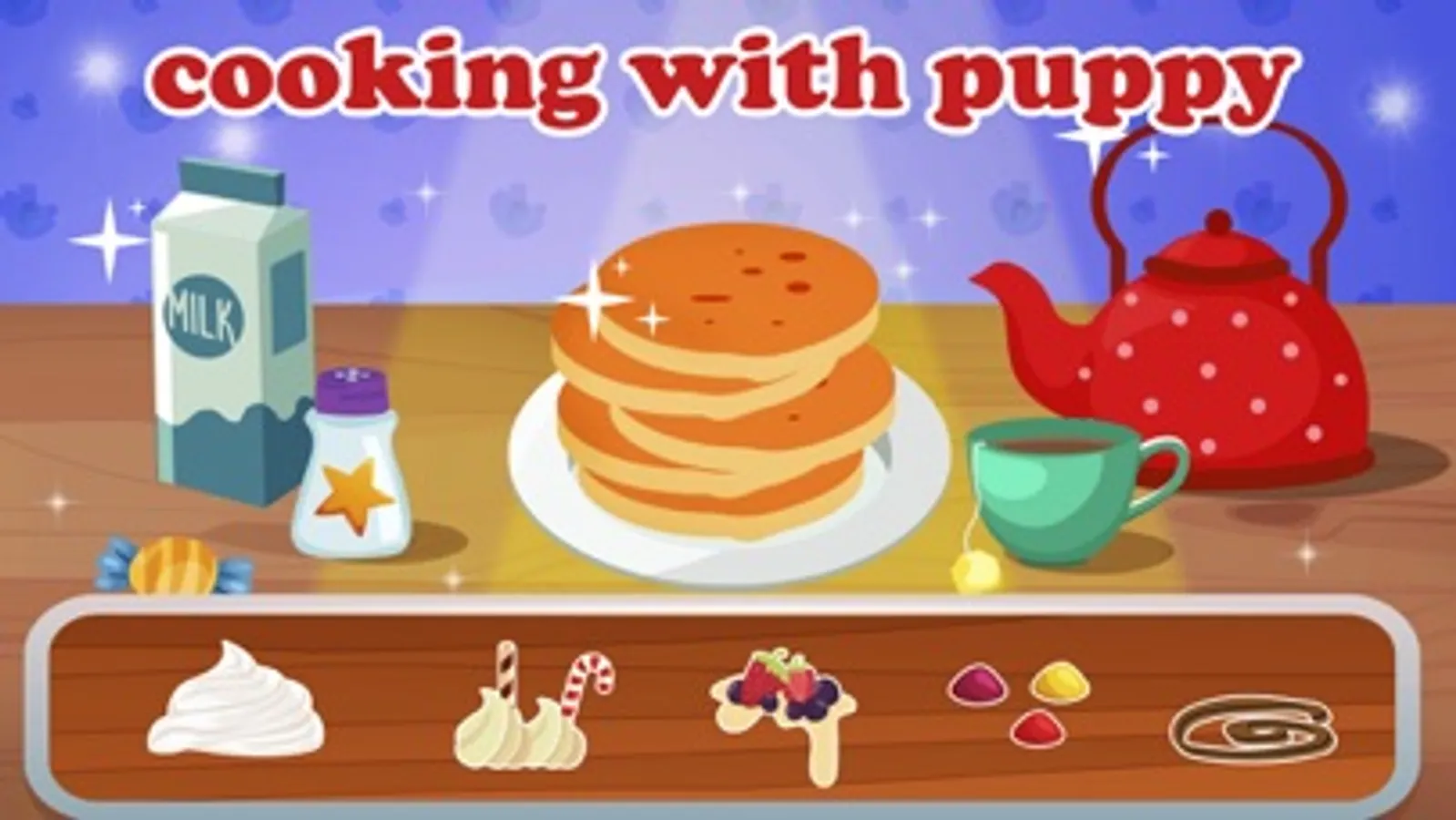 Decorate home by lots of items! In the form of various creams, fruits and colorful decorations that will make your pancakes not only delicious, but also beautiful. Good luck!