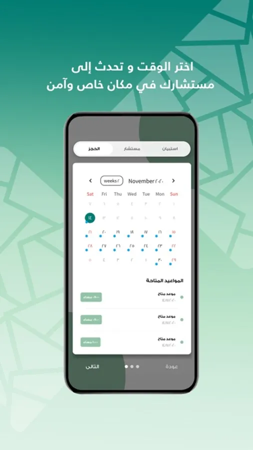 ٣- سنختار المستشار المناسب لحالتك: سنساعدك في العثور على أفضل مستشار لك ، إذا لم تكن راضيًا ، يمكنك التبديل في أي وقت. تحقق من جدول المعالج الخاص بك واختر التاريخ والوقت الذي يناسبك