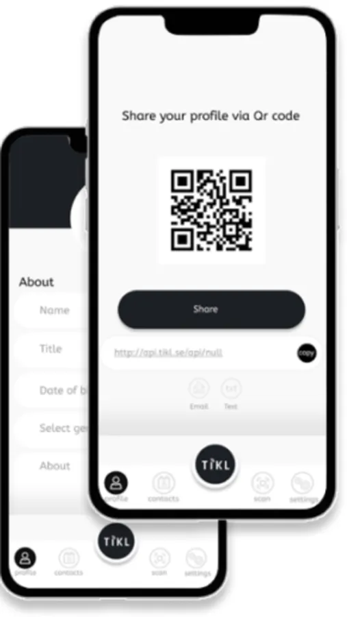 Med TIKL kan du direkt dela ditt digitala visitkort, sociala medier, musik, betalningsplattformar och kontaktinformation genom att helt enkelt knacka på telefonen till en annan.