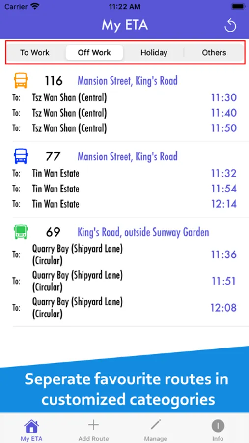 An ETA (Estimated Time of Arrival) tracking app for different Public Transport in Hong Kong, aims at providing a fast tracking way for your regular / frequently used routes. This app allows comparison of the ETA of several routes, maintained in several categories for easy glance.