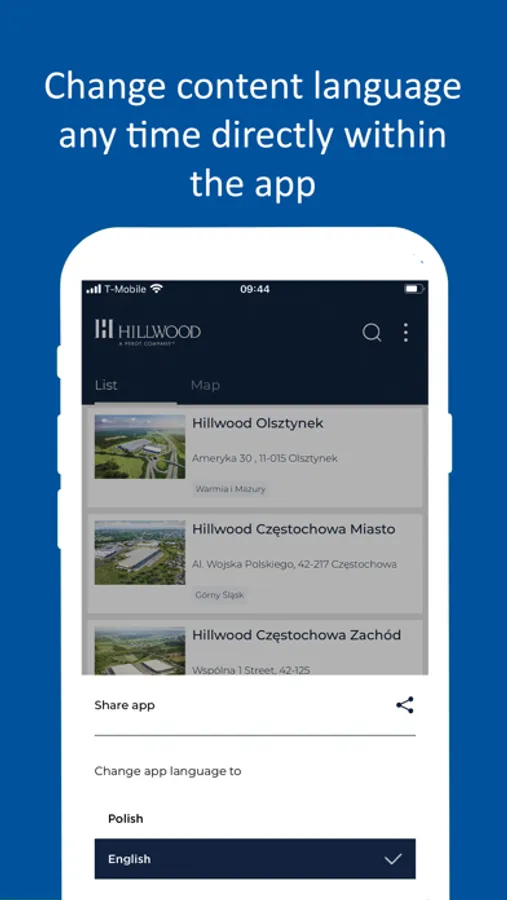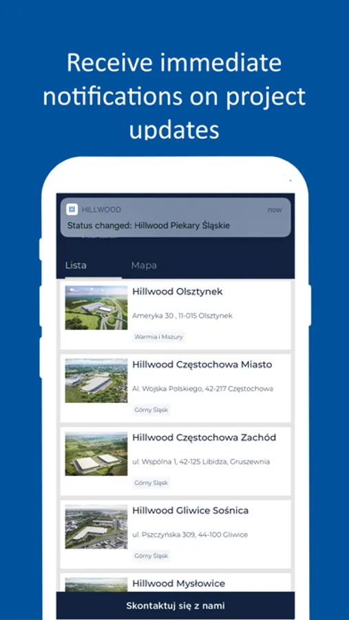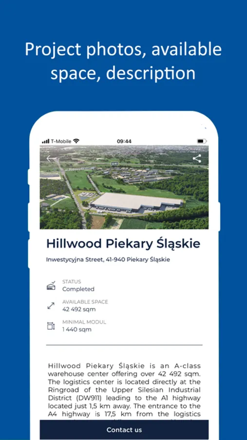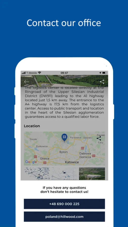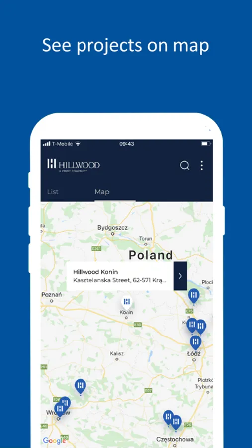 The application allows you to check all available Hillwood warehouse spaces throughout Poland and see the available marketing materials for individual properties, including virtual walks, 360 panoramas, e-brochures, real estate plans, photos and visualizations.