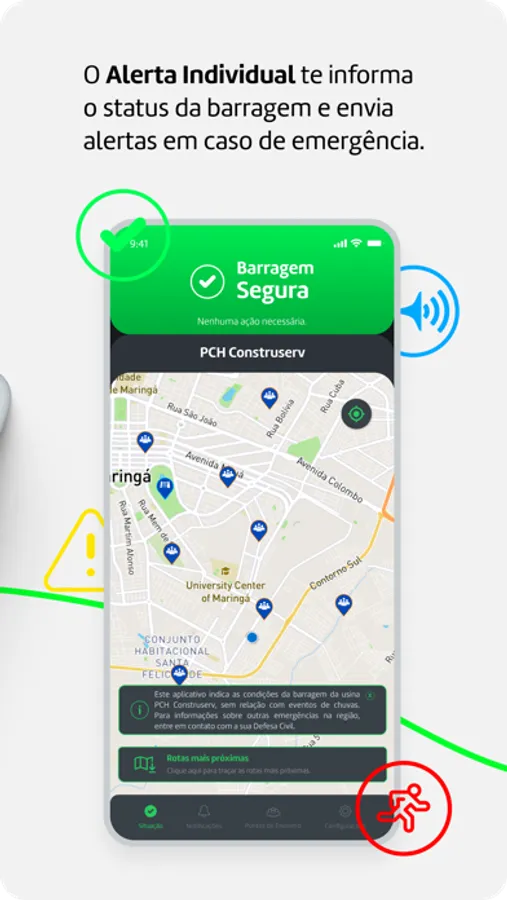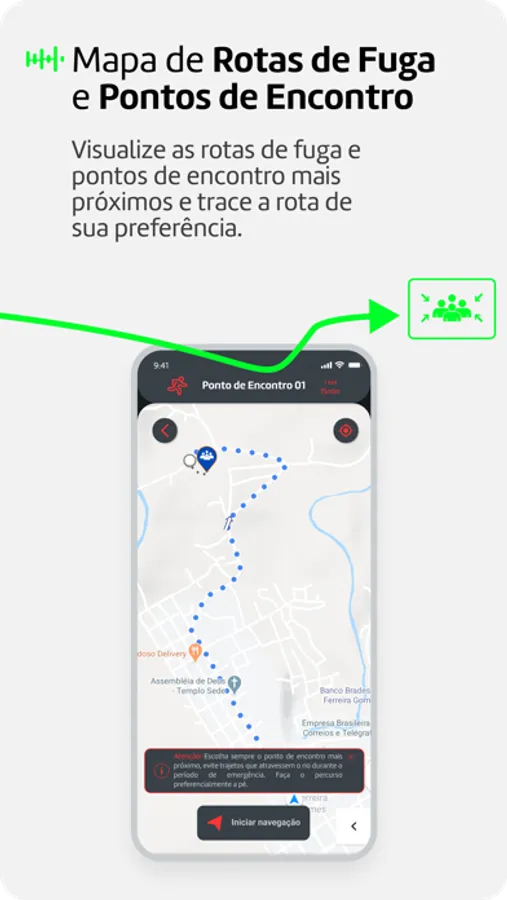 Barragem em Emergência – Em caso de emergência localize pelo App o ponto de encontro mais próximo e dirija-se até ele o mais rápido possível, evite trajetos com pontes e que atravessem rios.