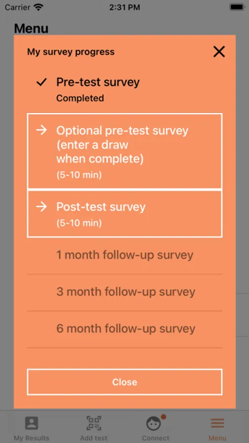 The Test app will also ask you to complete brief follow-up surveys, at different points in time after you test to find out how you’re doing and whether you have accessed care or supports.
