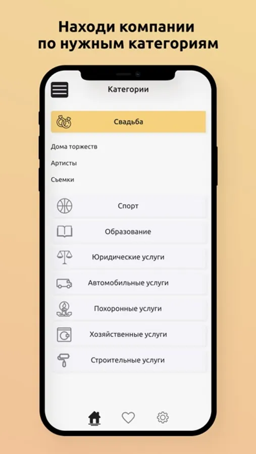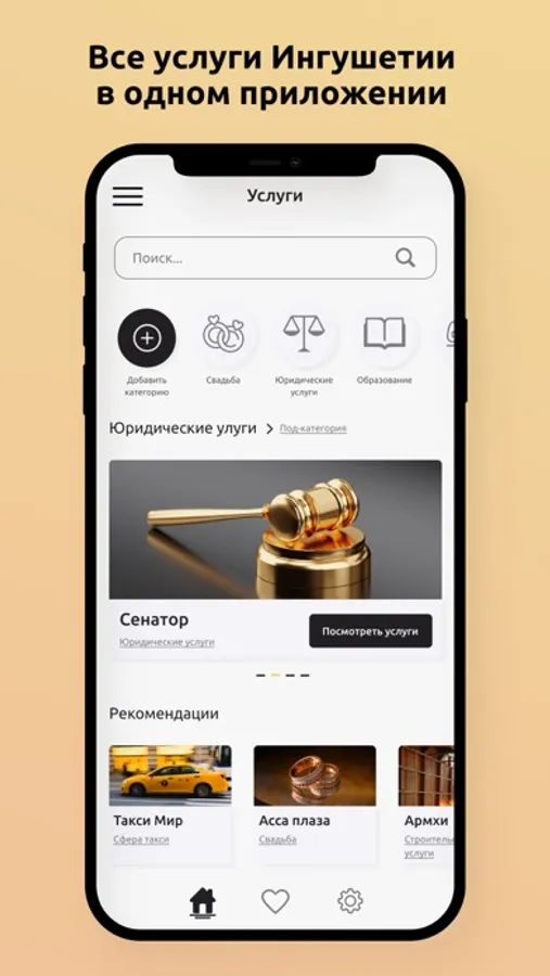 Мы собрали ингушские компании и услуги в одном приложении. Удобный и понятный интерфейс поможет пользователям находить услуги по категориям, сохранять понравившиеся компании и оставаться с ними на связи.