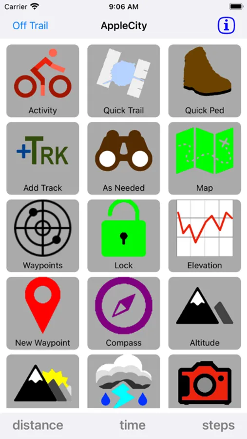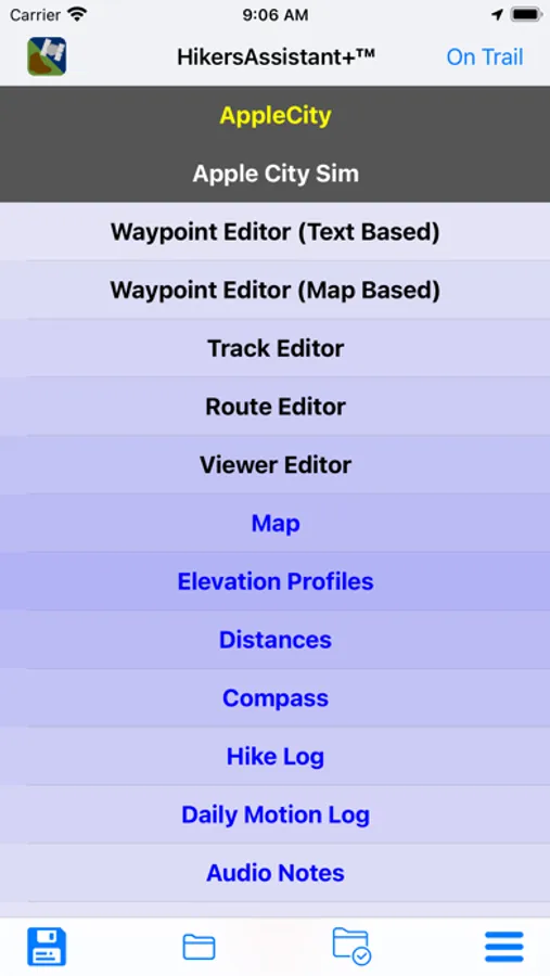 The on-trail home page uses large, easily seen buttons to execute modules that include GPS tracking, pedometer logging, maps, elevation profiles, distances and bearings to waypoints, creating new waypoints, a compass, getting elevation, sunrise/sunset/moon-phase, weather forecasts, and viewing park maps.