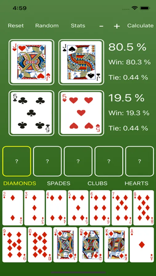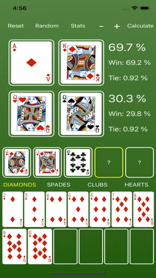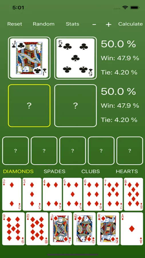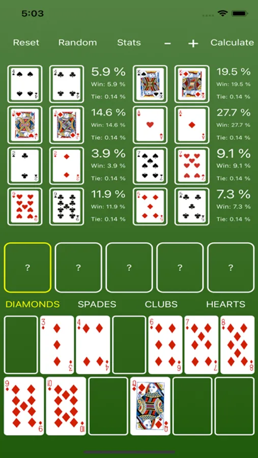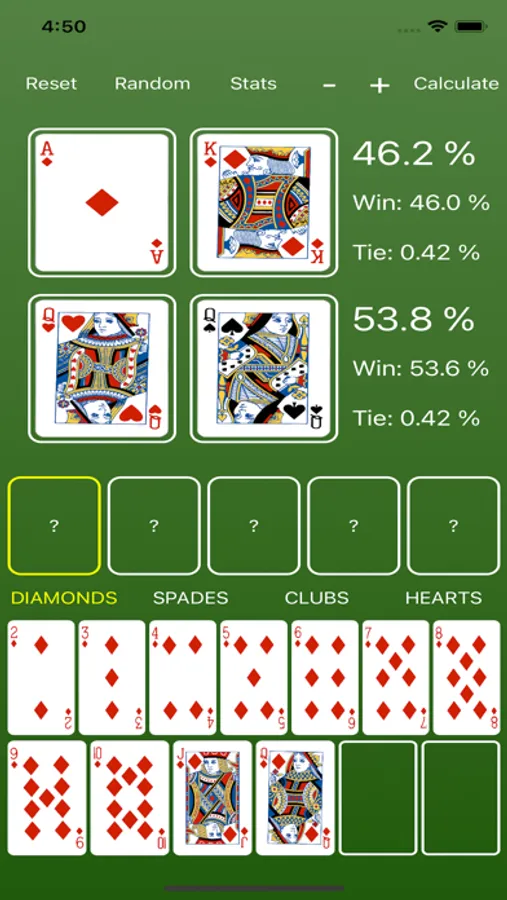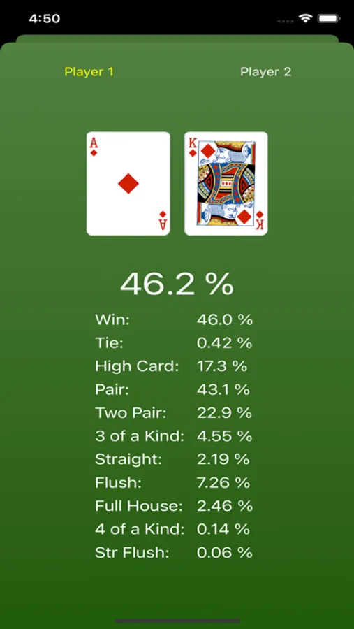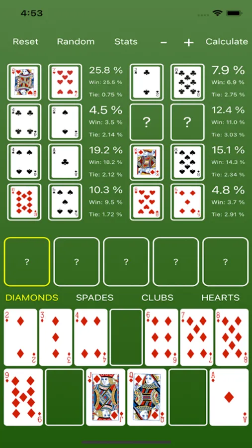 * After simulating a hand, you can view each player's specific stats by pressing the Stats button. To leave the stats page and return to the main screen, just swipe down on the screen.
