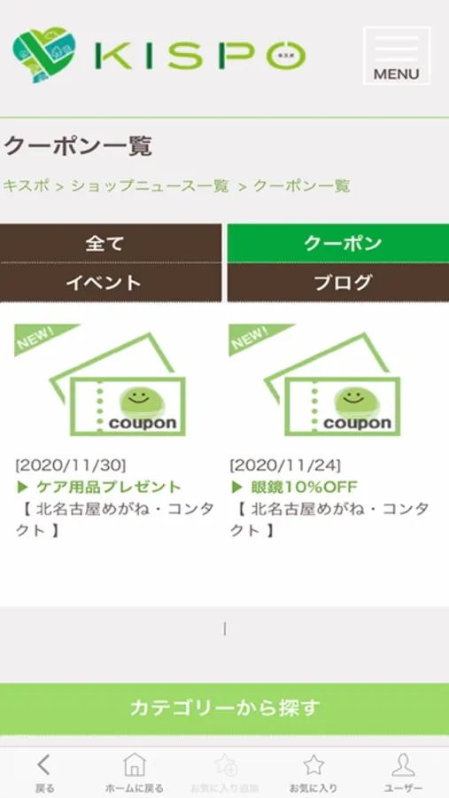 各商店や会社からのショップクーポンがまとめて表示されます。