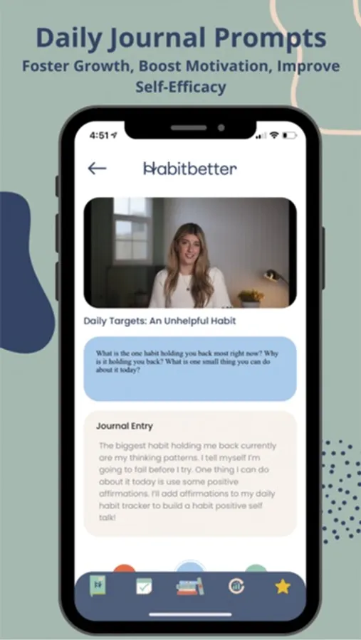 Our Daily Journaling Prompts are designed to increase motivation, reduce stress and internal obstacles, improve performance, and foster growth. Research shows that journaling improves self-efficacy and increases the likelihood of achieving goals. Habitbetter uses evidence based journaling techniques adapted from therapy based techniques such as CBT, ACT and DBT to help you re-wire your brain for joy and achievement. Our prompts are written and approved by a licensed therapist and MBA team to be sure they are based on the latest research and designed to support your journey.