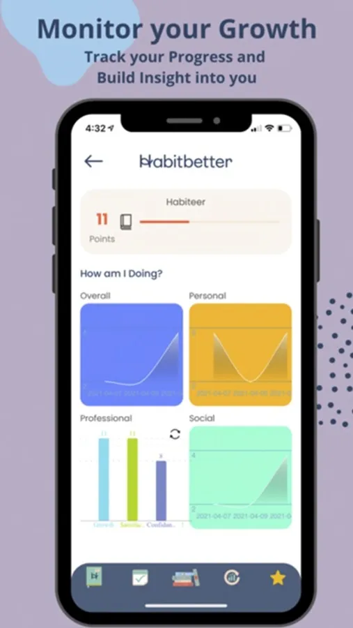 -“Check-In” along the way to track trends in your Personal, Social, and Professional well being. Gain insight into what makes you, “you.” Understand how your habits are affecting your Satisfaction, Confidence, Growth and Stress.