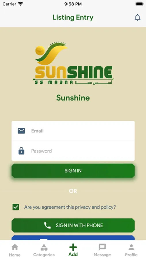 Thanks for downloading the Sunshine application, create your profile by registration, browse home and reach categories you need to see, then add goods & services in listing entry with some details to submit. finally, You can message the buyer/ seller for communication.