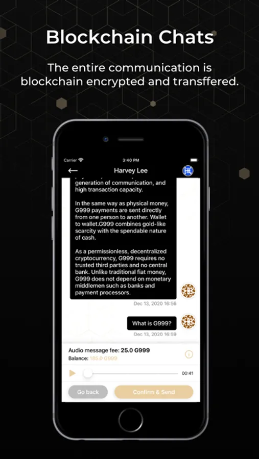 GSTelecom is a blockchain encrypted messaging service developed under the technology of G999 Blockchain. It uses the blockchain technology to send one-to-one direct encrypted messages, which can include files, voice notes, images and videos. GSTelecom uses G999 blockchain public keys as identifiers and secures all communications to other GSTelecom users with blockchain encryption. The APP includes the blockchain explorer transparency by which users can independently verify the identity of their contacts and the integrity of the data channel. GSTelecom software is open-source and anyone can verify the authenticity of the code.