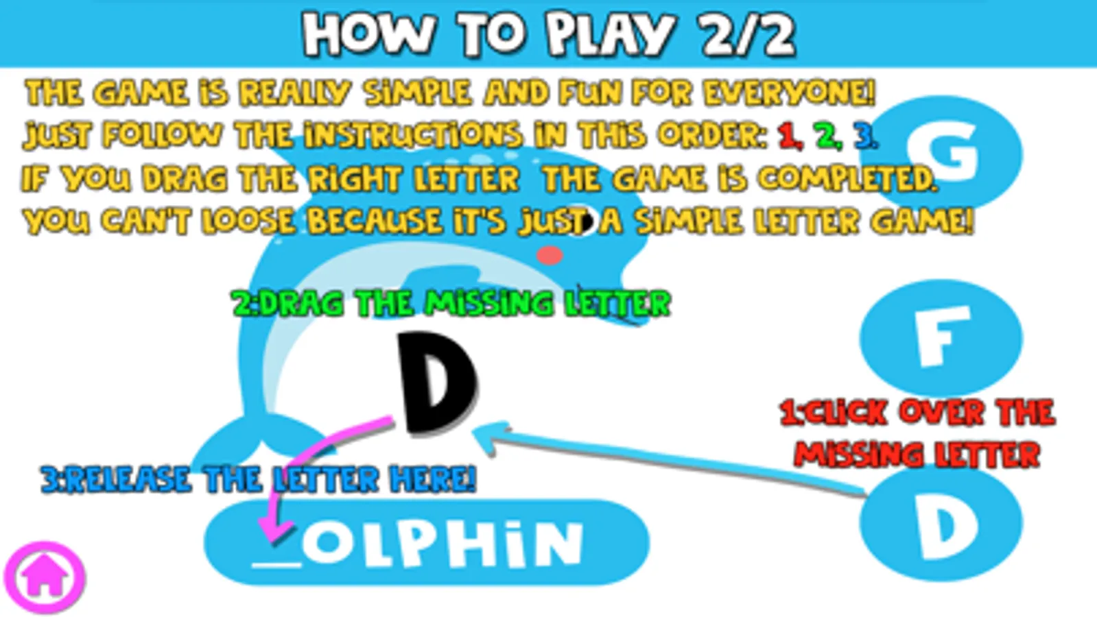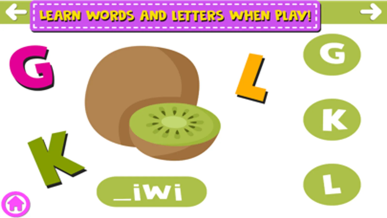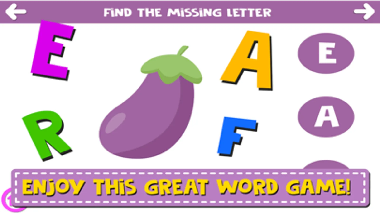 Anyway You can’t lose because it’s just a simple word letter game; also when play you can learn the correct name of the objects and the alphabet letters.