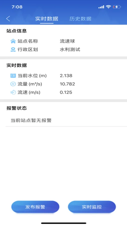 用户通过手机端查看河道或水库等水利场景监控视频、水位数据、流速数据等,并根据实际情况与前端对讲或发布报警信息