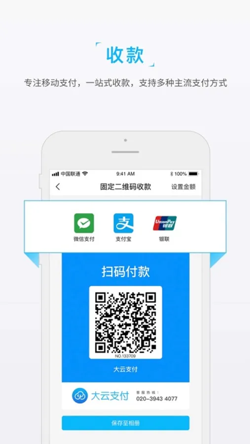 大云支付是一款给商户提供多种收款方式的移动产品,主要解决移动支付收款问题,让收款更便捷。