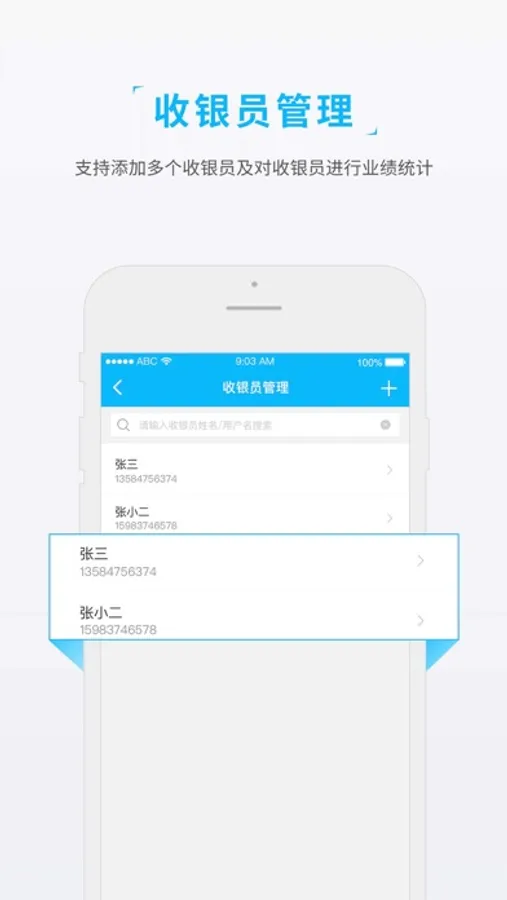 【收银员管理】可添加多个收银员账户,收款统一进入商户账户,根据业务需求配置收银员权限。