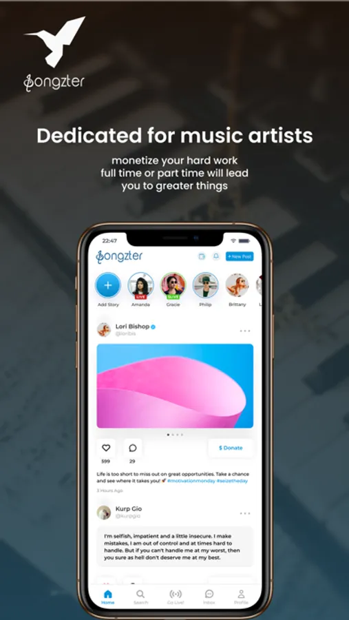 With SONGZTER you can post all your work as music videos, pictures, audio and live stream. SONGZTER gives your followers the option to tip you directly without leaving your live streaming, they can also tip you on your posts, ARTISTS: you can create a free content profile or select one of the subscription plans to charge monthly. On the free profile you would build audience, they can still send you tips on your live streaming or tip on your posts while the paid subscription plan your fans can signup for a monthly subscription and have access to extra features as private message and so.