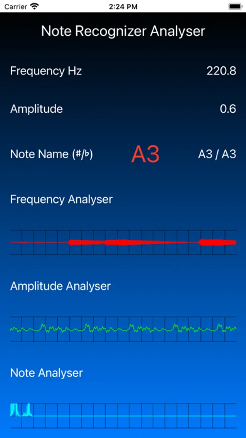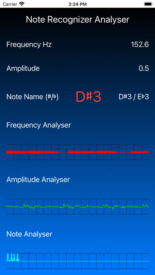 The Note Recognizer Analyser analyses the pitch frequency that you sing or play, and gives the corresponding note name with graph. Very useful for singers who need to find the right starting note of a song. Or if you want to know the key of a song; sing the tonic, and you get the note name of the key.