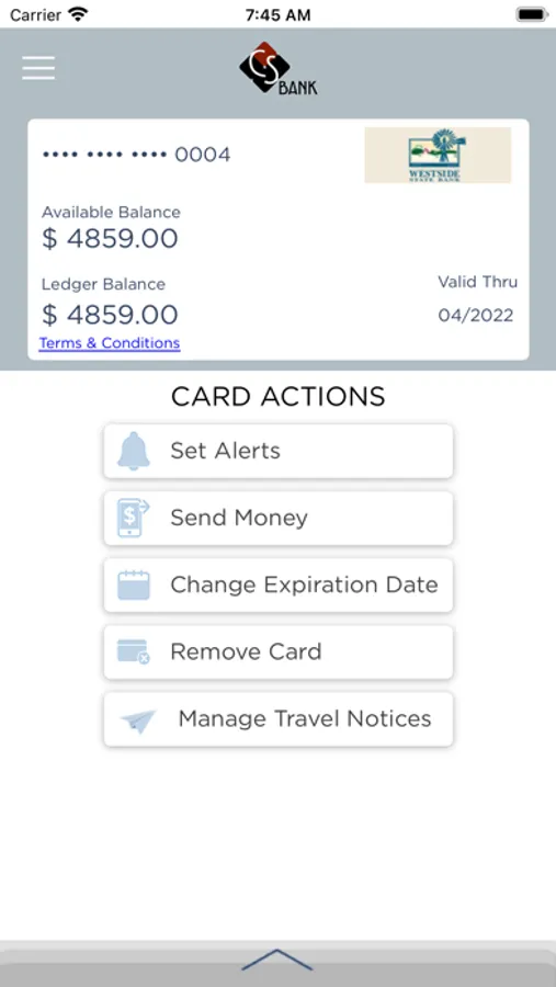 CS Bank Card Manager is the best place to manage your debit card. CS Bank helps protect your debit card by sending you alerts when your card is used so you can quickly detect unauthorized or fraudulent activity on your account. Users have the option to receive alerts via text or email. You can also check your account balance anytime, turn your card off and on, send money to other users and find nearby ATMs.
