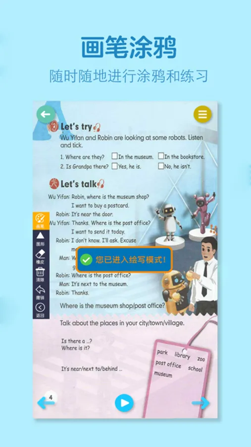 【2】画笔功能,全屏涂鸦让学习更加的有趣让学习更加高效率。完全同步最新发行教材,绝无缺漏页现象。
