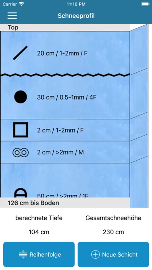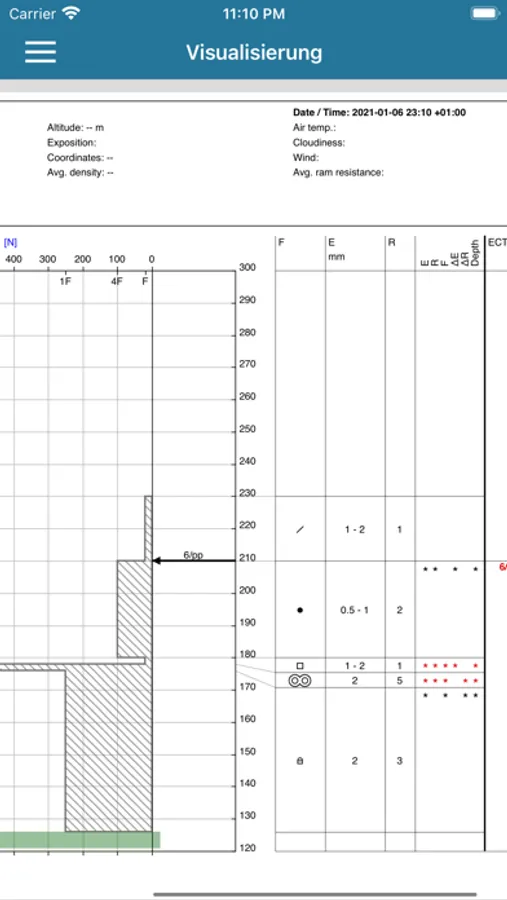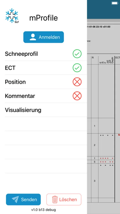 mProfile dient zur direkten Übermittlung von Schneeprofildaten (vereinfachte Profile: hasty pits) aus dem Gelände. Die App bietet die Möglichkeit zur Eingabe des Resultates des erweiterten Säulentests (ECT) und der Schichteigenschaften (Kornformen, Korngrössen und Härten) der Schneedecke an einem bestimmten Ort. Die Daten können visualisiert werden.