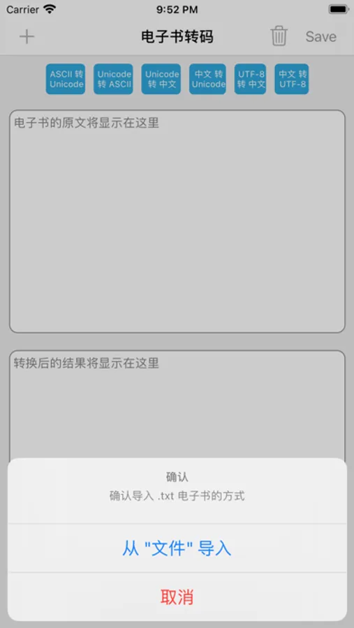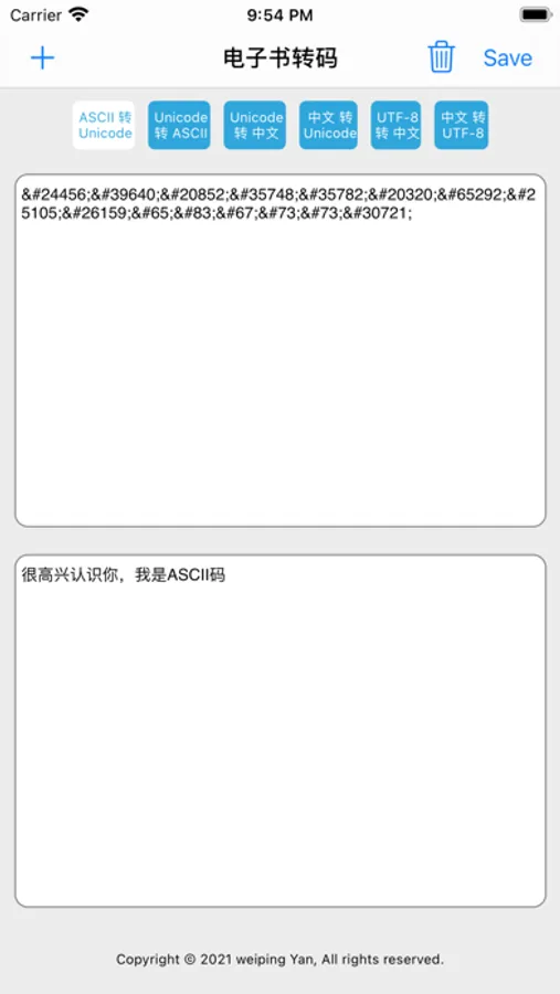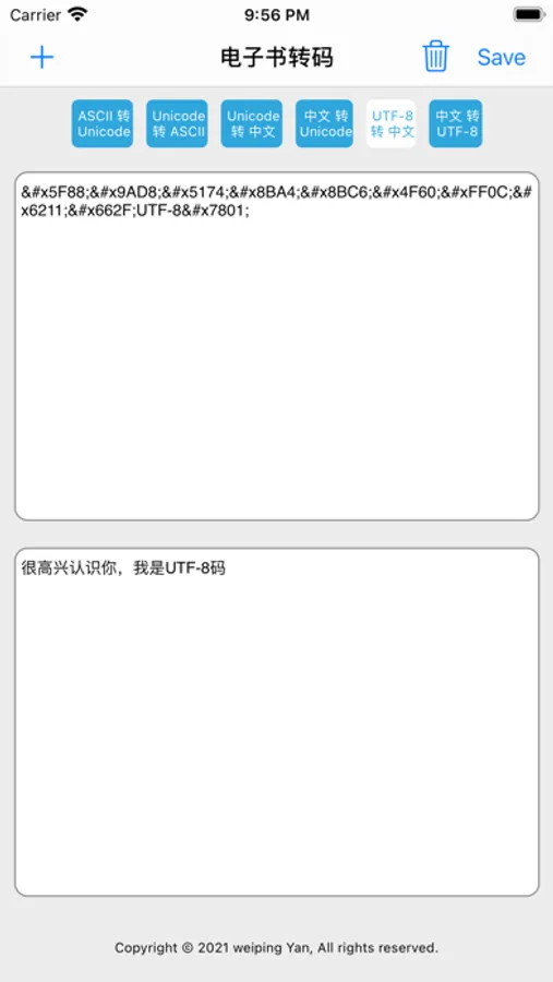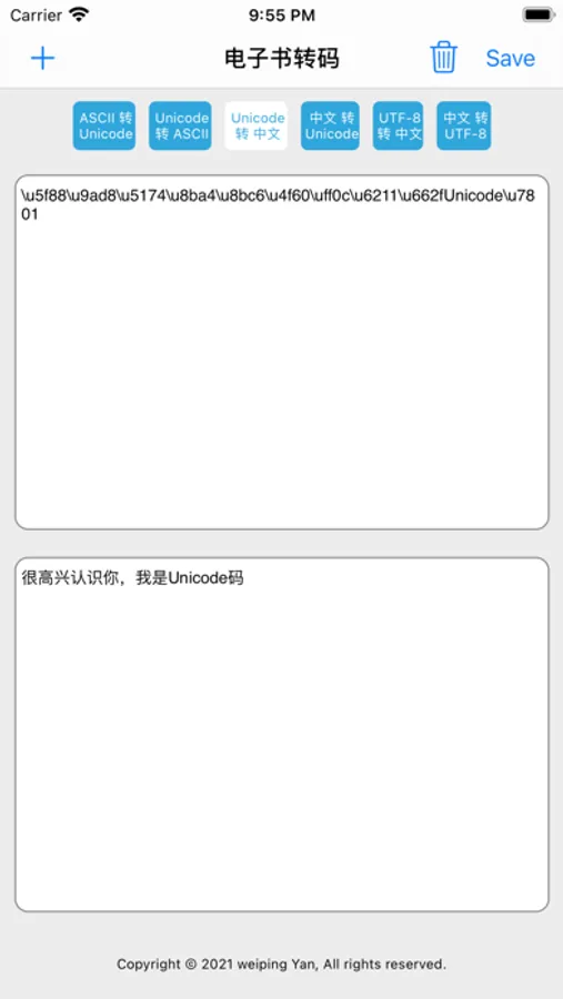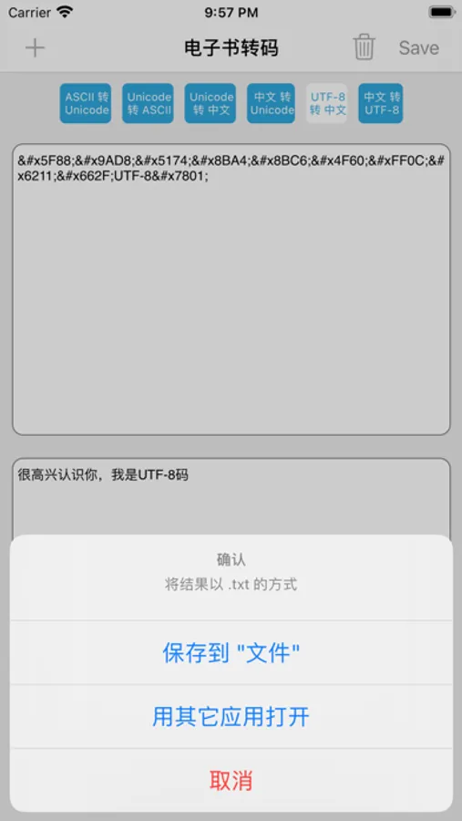 这是一个 txt 文件编码转换的工具,集Unicode与ASCII互转、Unicode与中文互转、中文与UTF-8互转于一体,支持从文件导入和导出,亦支持从其它应用打开,让你体验不一样的移动阅读。
