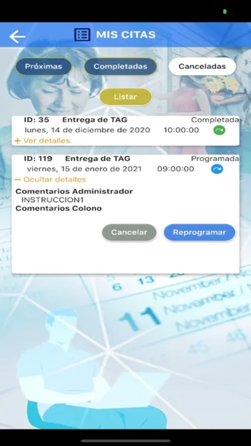Aplicación agenda para colonos, reserva una fecha y horario para realizar tus tramites con administración. Gestiona tu historial de citas y otros servicios.