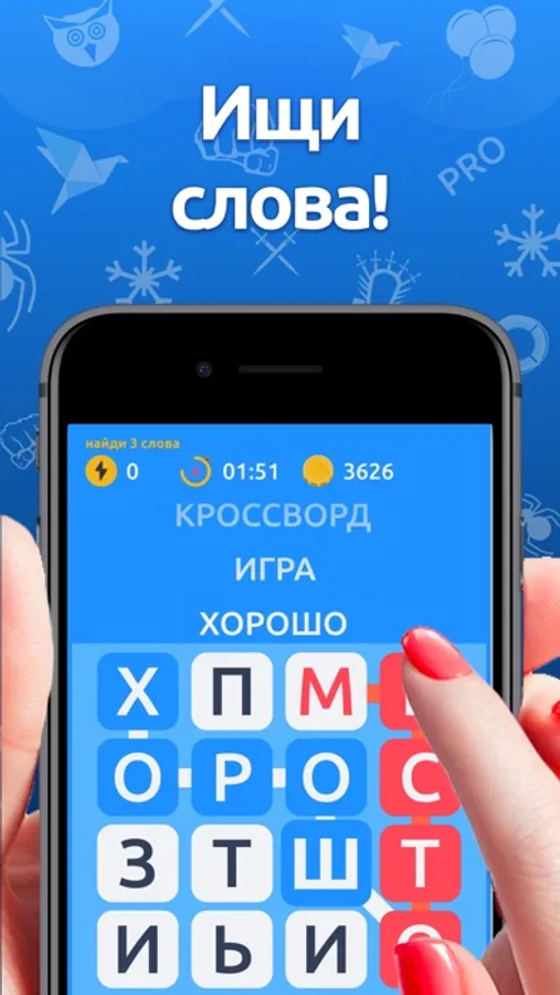 - Не поднимая палец, соединяй буквы на игровом поле в слова.