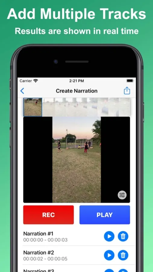 Just position your video at the moment you want to narrate, press the REC button and create your narration using your device's microphone while seeing the video footage being played.