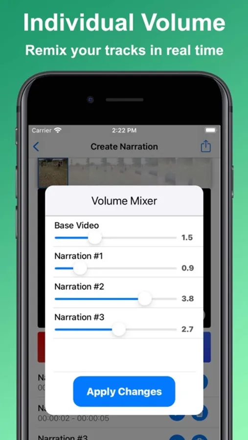 Each narration track has it's own volume that can be tweaked and previewed in real time in order to create the perfect video.