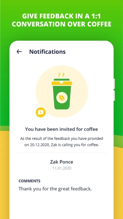 The best feedback is provided in a conversation. With WeGrow, you can "invite coffee" to a colleague so you can talk about what are their strengths and areas to improve. Inviting for coffee is an excuse to discuss the feedback in more detail, get examples of what went well, what to improve, and make sure your fully understand the context of their feedback.
