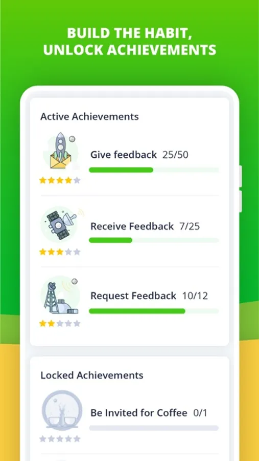 With continuous positive reinforcement, it's easier for us to build habits. WeGrow provides badges for giving feedback, requesting feedback, receiving feedback, inviting for coffee, etc. It's a great way to get motivated and build a culture of feedback in the organization.