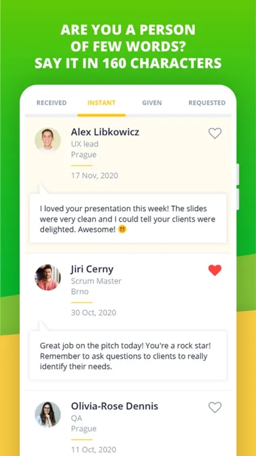 Did you see excellent work from a colleague? Tell them! With Instant Feedback, you can share your thoughts in 160 characters. It's a quick and easy way to recognize your colleagues or let them know what to improve on.