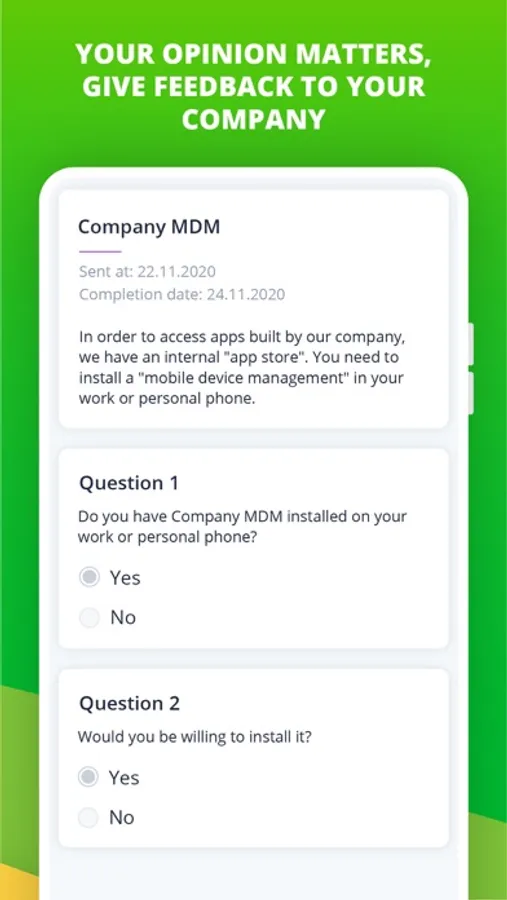 It's important for employees to provide feedback to the organization. With WeGrow, whenever a company asks for feedback, you can answer the survey from your phone. Your responses are anonymous and the organization will only see aggregate data from you, such as age bracket, gender distribution of responses, tenure brackets, and office you belong to.