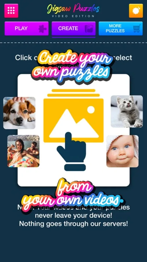 Really important: Your videos and your puzzles never exit your device. They don't transmit on any server, they are processed locally and never leave your device.