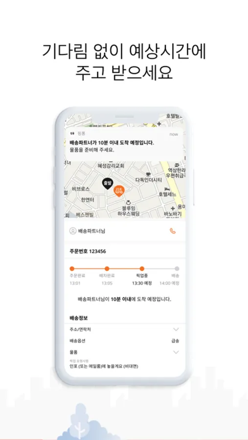 - 실시간 예상 도착시간과 배송현황 안내로 막연한 기다림을 최소화 합니다.